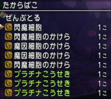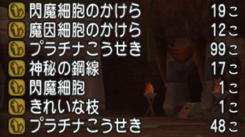 1時間やりました結果 神秘の鋼線 17こ プラチナこうせき147こ 閃魔細胞のかけら 19こ